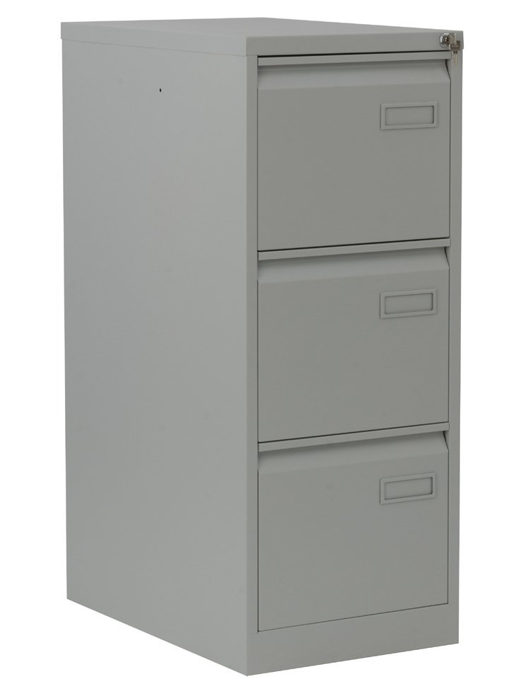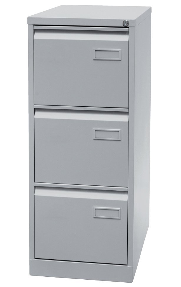 Three-drawer metal file cabinets for documents or A4 and Foolscap hanging pockets, width 413 or 470, height 1016, depth 622 mm, central lock, various colors.