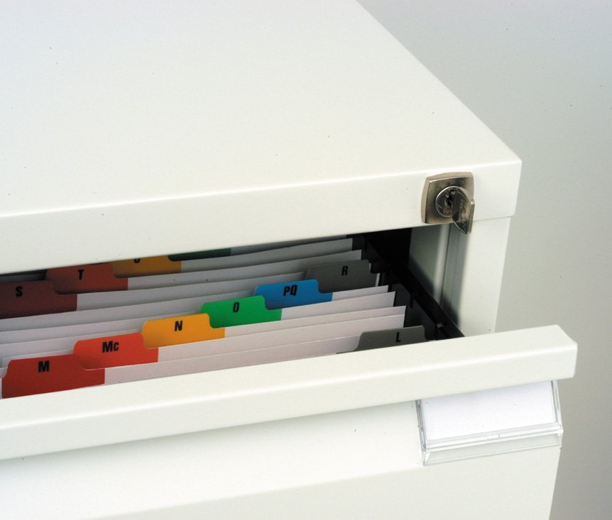 Four-drawer card filing cabinets for documents or hanging files in A4 or Foolscap format, width 413 or 470, height 1321, depth 622 mm, central lock, various colors. In stock in light grey, beige and white.