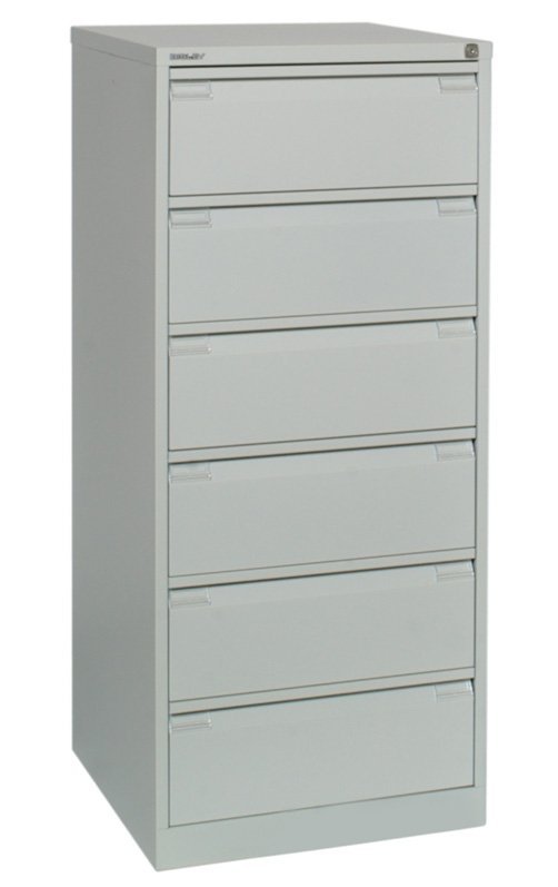 Six-drawer metal filing cabinets for A5 format envelopes (the archived document can be up to 235 mm wide), total width 568, height 1321, depth 622 mm, various colors. In the color light gray RAL 7035 in stock.