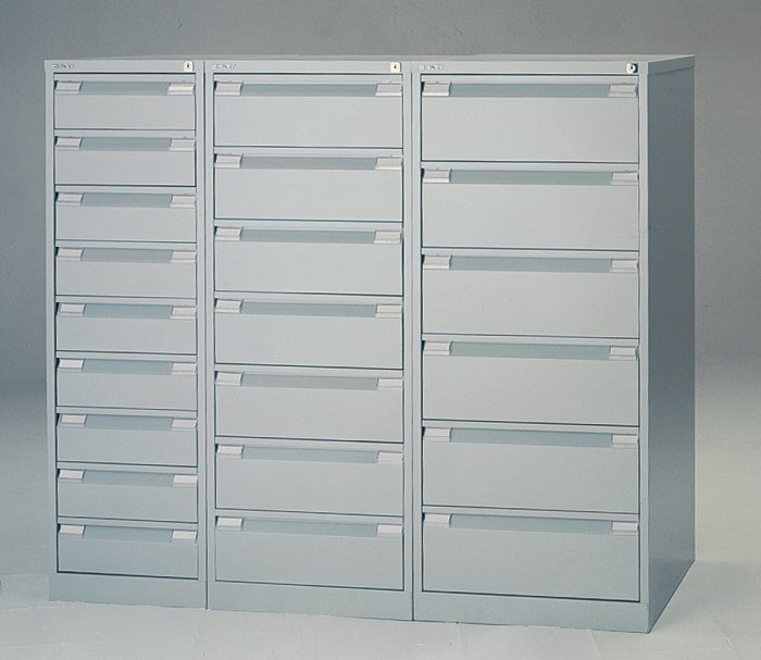 Three-drawer metal filing cabinets for documents or hanging files in A4 or Foolscap format, width 413 or 470, height 1016, depth 622 mm, central lock, various colors. Available in light gray or beige (width 413 mm).
