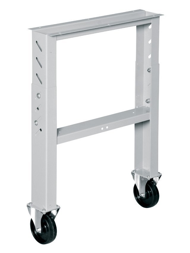 Adjustable leg for work tables, leg width 96 mm, height 660 - 1025 mm, depth 610 or 710 mm. 2x 125 mm solid polypropylene wheel, load capacity 150 kg.