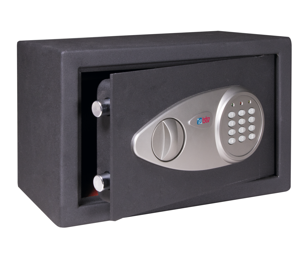 Furniture safe with electronic code locking + emergency key. Height 170 x width 230 x depth 170 mm. Powered by 4x 1.5V pencil batteries.