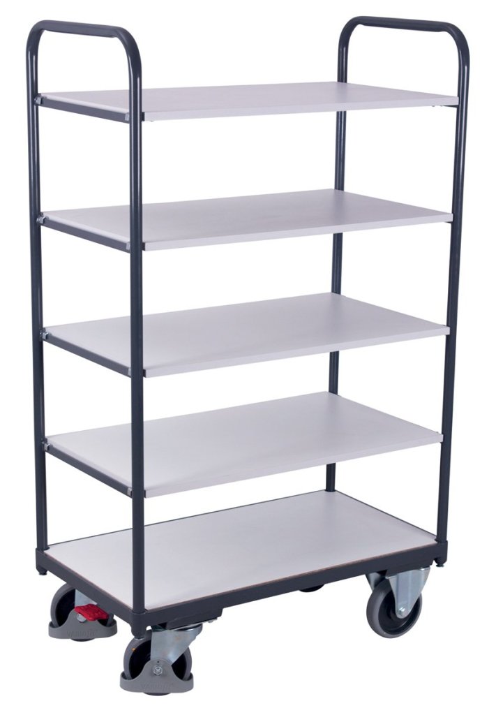 Shelf antistatic trolley. Steel construction, chipboard loading surface - light gray. Surface treatment with RAL 7024 dark gray powder coating, resistant to impacts and scratches. Antistatic wheels with ball bearings, 2 swivel with central Easy Stop brake, 2 fixed. Dimensions height 1010 x width 975 x depth 525 mm.