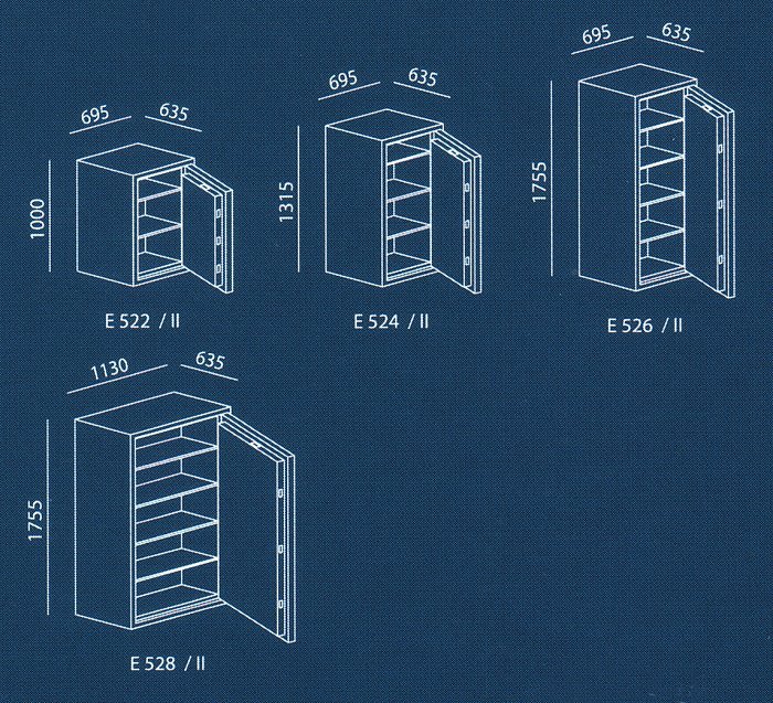 Armoured safe Royal E 526 S, security class 2. Safe for the protection of valuables, large amounts of cash and documents. Exclusive design. External dimension - H 1755 x W 695 x D 635 mm, internal dimension - H 1500 x W 545 x D 400 mm. Weight 645 kg.