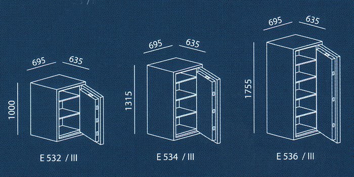 Royal E 534 S armored safe, security class 3. For the protection of valuables, large amounts of cash and documents. Color light gray + dark gray. External dimension - H 1315 x W 695 x D 635 mm, internal dimension - H 1060 x W 545 x D 400 mm. Weight 690 kg. Modern design, the edges of the body of the safe are gently beveled, the doors are precisely fitted. Three-walled body filled with fire-resistant insulation, double door fold. Door wall thickness 148 mm, safe wall thickness 75 mm.