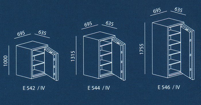 Royal E 544 SS armored safe, security class 4. For the protection of valuables, large amounts of cash and documents. Color light gray + dark gray. External dimension - H 1315 x W 695 x D 635 mm, internal dimension - H 1060 x W 545 x D 400 mm. Weight 720 kg. Modern design, the edges of the body of the safe are gently beveled, the doors are precisely fitted. Three-walled body filled with fireproof insulation, double door fold. Door wall thickness 148 mm, safe wall thickness 75 mm.