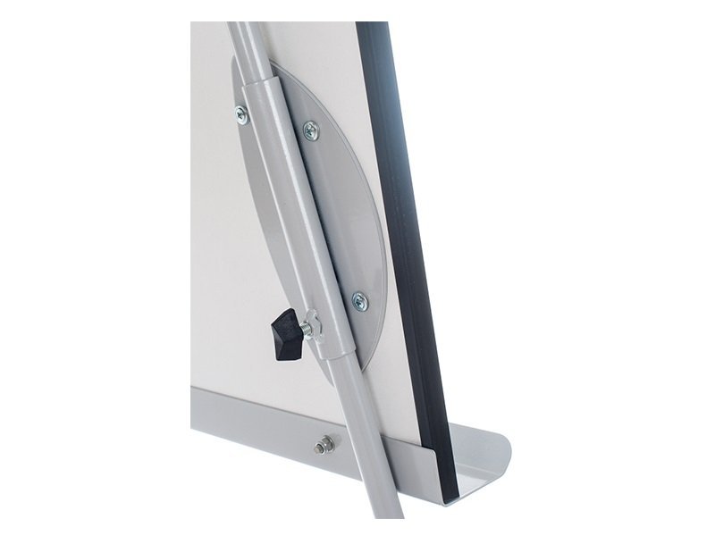 White lacquered magnetic board on a tripod. The board is height adjustable. Size 100 x 150 cm. Supplied with a storage rail for markers, a rail for fixing paper blocks and arms for hanging paper sheets.