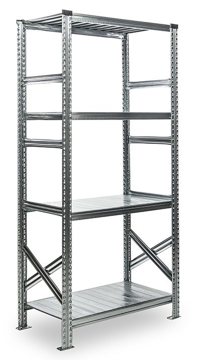 Screwless SUPER extenison rack intended for setting up base SUPER racks. Possibility to add to infinite lengths. Galvanized design, 4 shelves, shelf capacity 200 kg. Height 1576 mm, shelf width 900 mm, shelf depth 400 mm.