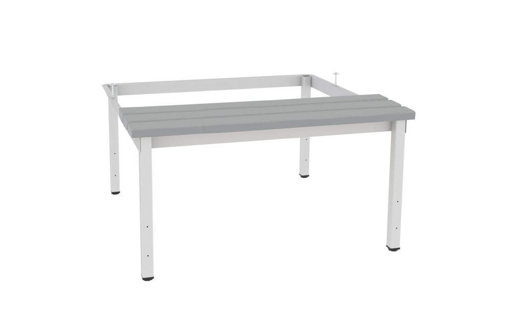 Bench with legs with rectification. Dimensions: height 390 x width 890 x depth 745 mm. Colored design of the legs in the color of the body. Grey plastic plate.