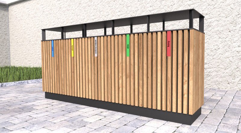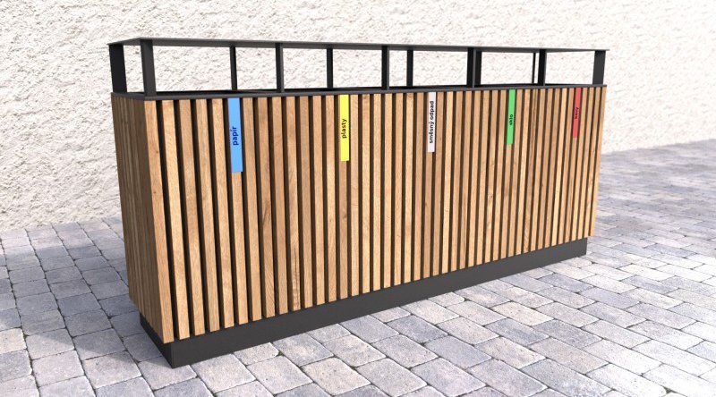Outdoor trash can for sorted waste with a wooden shell and roof. The wooden slats are treated 3 times with a glaze that protects outdoor furniture from UV radiation and weather effects. The basket has removable galvanized inserts for waste with a volume of 65 l. Weight 98 kg.