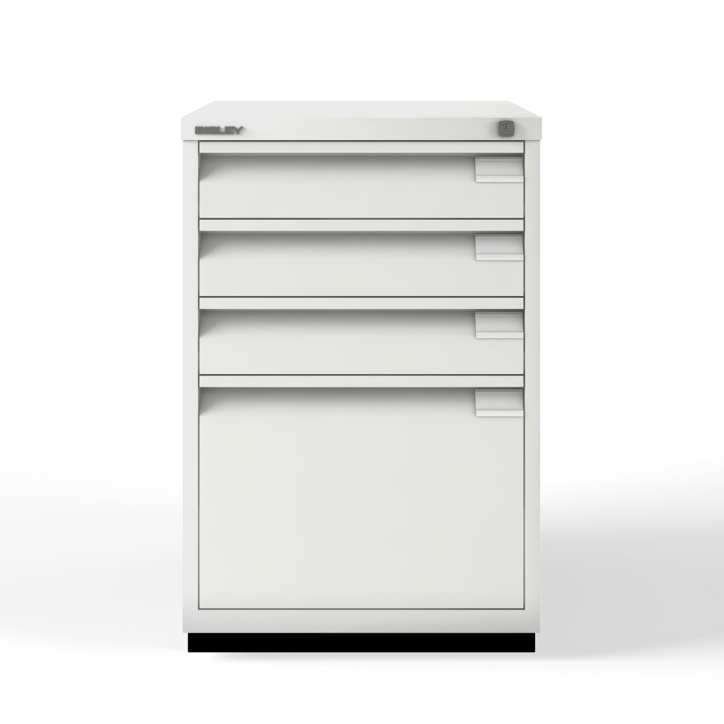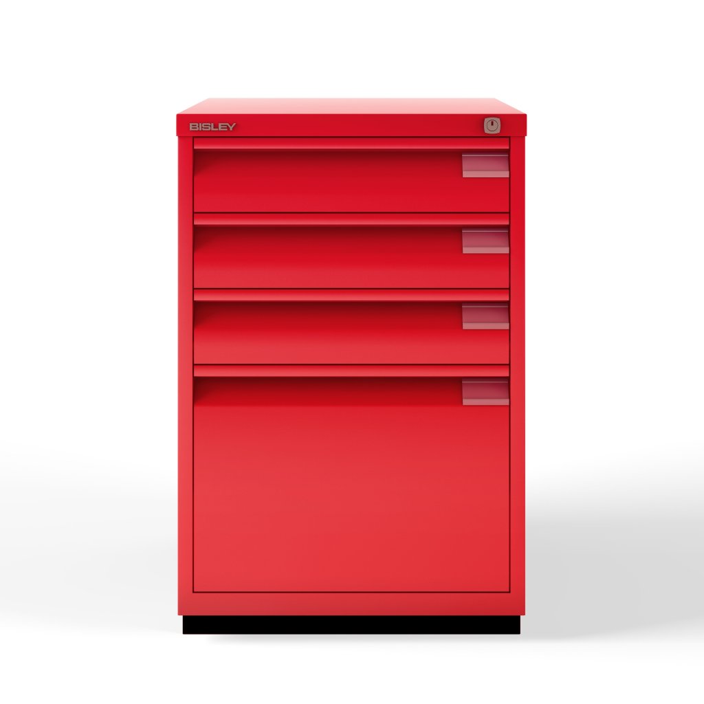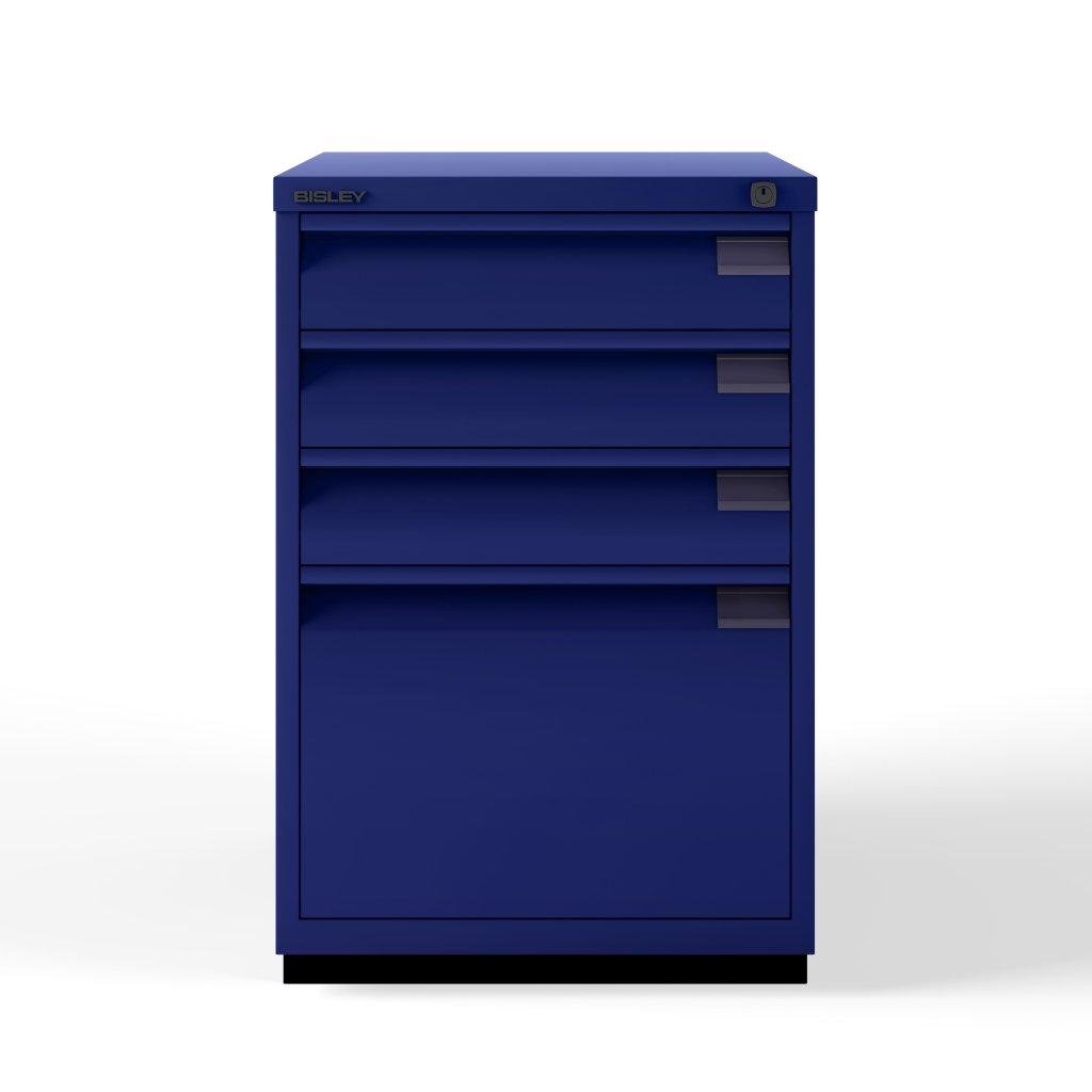 Four-drawer metal file cabinet Bisley 1F3E, width 470, height 711, depth 470 mm, different colors, standard handles (pro-molded). The tall drawer is equipped with a removable reducing bar for hanging pockets of A4 format.