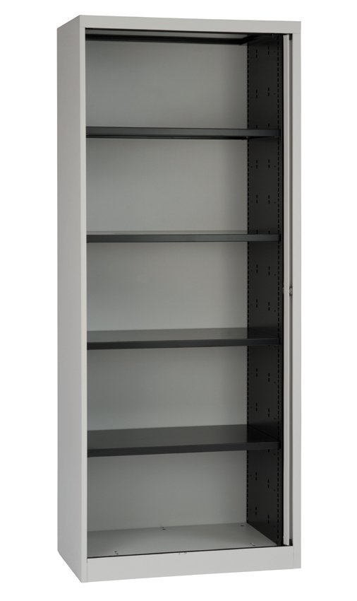 Metal cabinets with horizontal shutters with four shelves, width 800, height 1980, depth 430 mm, various colors.