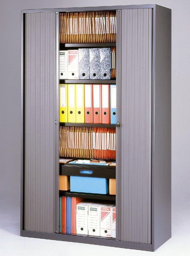 Metal cabinets with horizontal shutters with three shelves width 1200, height 1637, depth 430 mm, various colors.