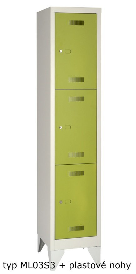 Welded wardrobe with solid doors, on a plinth or on legs. Compartment width 300 mm, height 1700 mm, with plinth 1806 mm, with legs 1850 mm, with base bench 2100 mm. The bench is equipped with rectification feet as standard. The lock can be chosen as a cylindrical lock, with an additional charge, a lock for a padlock or a rotary code lock. Body color light gray (RAL 7035), door color of choice.