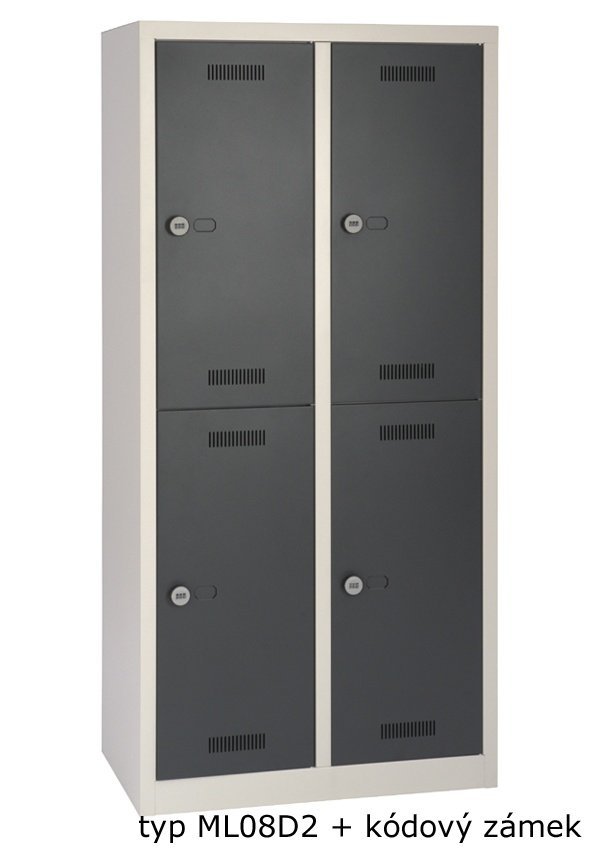 Welded wardrobe with split doors, on a plinth or on legs. Compartment width 400 mm, height 1700 mm, with plinth 1806 mm, with legs 1850 mm, with base bench 2100 mm. The bench is equipped with rectification feet as standard. The lock can be chosen as a cylindrical lock, with an additional charge, a lock for a padlock or a rotary code lock. Body color light gray (RAL 7035), door color of choice.