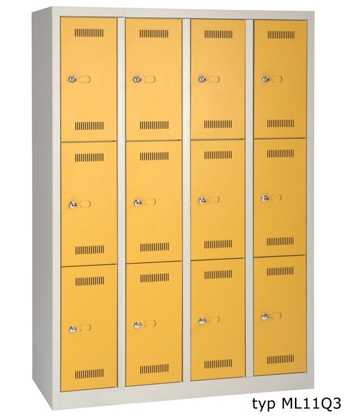 Welded wardrobe with solid doors, on a plinth or on legs. Compartment width 400 mm, height 1700 mm, with plinth 1806 mm, with legs 1850 mm, with base bench 2100 mm. The bench is equipped with rectification feet as standard. The lock can be chosen as a cylindrical lock, with an additional charge, a lock for a padlock or a rotary code lock. Body color light gray (RAL 7035), door color of choice.
