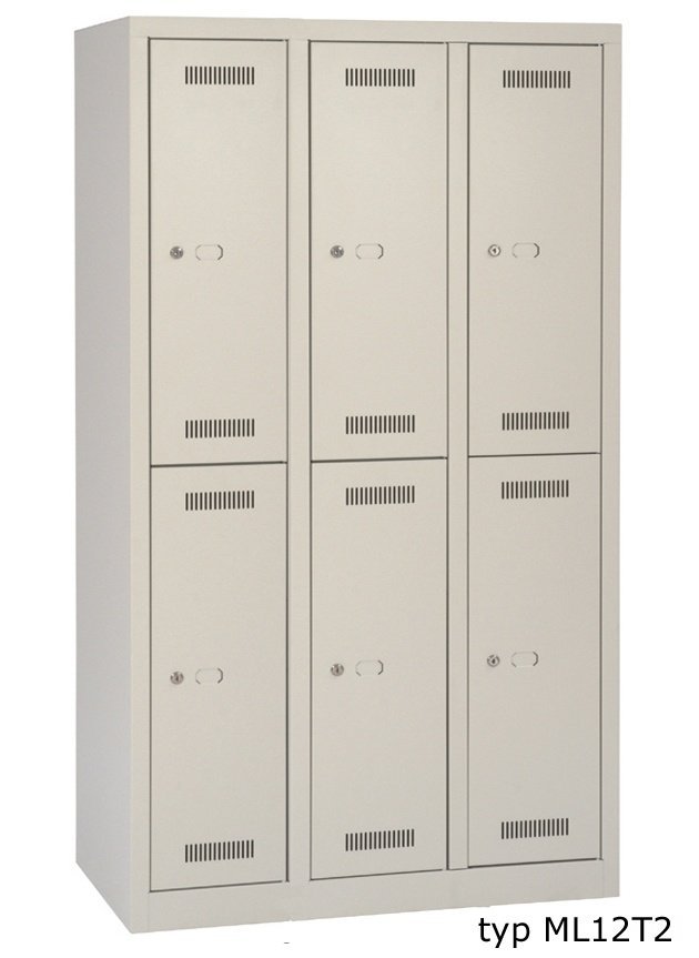 Welded wardrobe with solid doors, on a plinth or on legs. Compartment width 300 mm, height 1700 mm, with plinth 1806 mm, with legs 1850 mm, with base bench 2100 mm. The bench is equipped with rectification feet as standard. The lock can be chosen as a cylindrical lock, with an additional charge, a lock for a padlock or a rotary code lock. Body color light gray (RAL 7035), door color of choice.