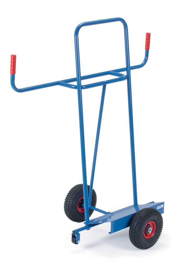 Board for board material made in Germany, welded steel construction, non-slip loading surface made of waterproof plywood. The cart is very easy to handle. Color blue RAL 5007. 4 special Fetra TPE pneumatic wheels, of which 2 swivel with brake, 2 fixed.