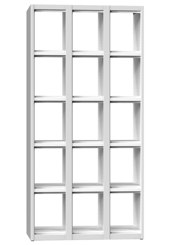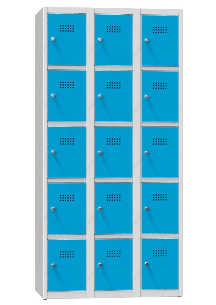 Metal cabinet with fifteen lockable boxes, width 900, height 1850, depth 500 mm. The width of each compartment is 300 mm, the lock can be replaced with a padlock or coin lock. Body color RAL 7035 light gray.