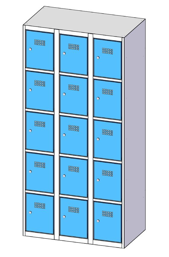 Cabinet with lockable boxes, height 1850 x width 900 x depth 500 mm, cylinder lock with simple deadbolt or padlock closure. Ventilation holes in the door, height of the box 390 mm, through width of the wardrobe cell 250 mm.