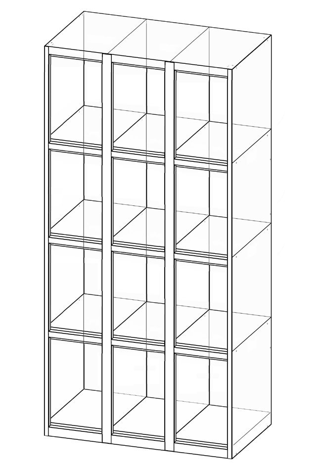 Metal cabinet with twelve lockable boxes, width 900, height 1850, depth 500 mm. The width of each compartment is 300 mm, the lock can be replaced with a padlock or coin lock. Body color RAL 7035 light gray.