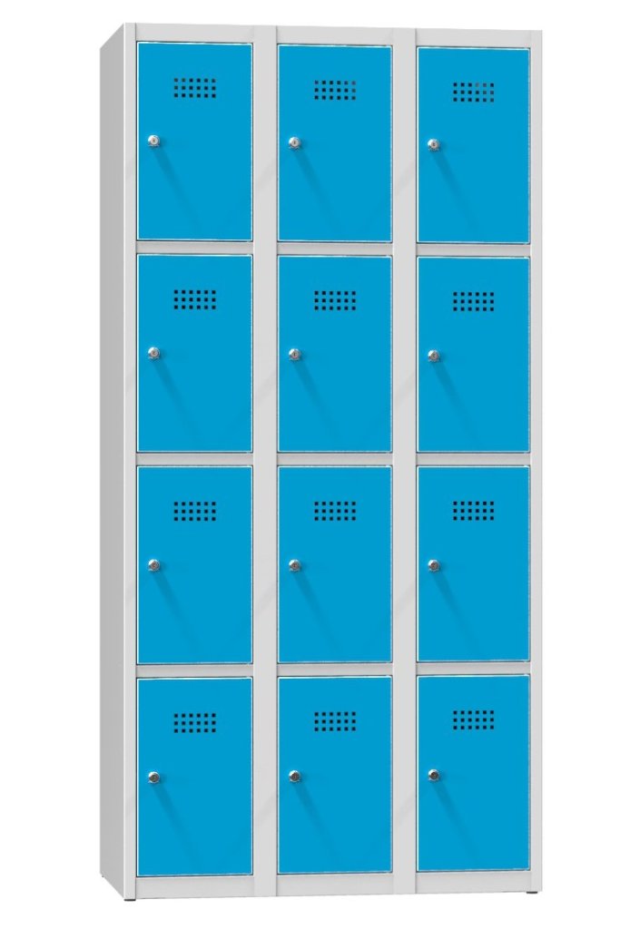 Cabinet with lockable boxes, height 1850 x width 900 x depth 500 mm, cylinder lock with simple deadbolt or padlock closure. Ventilation holes in the door, height of the box 390 mm, through width of the wardrobe cell 250 mm.