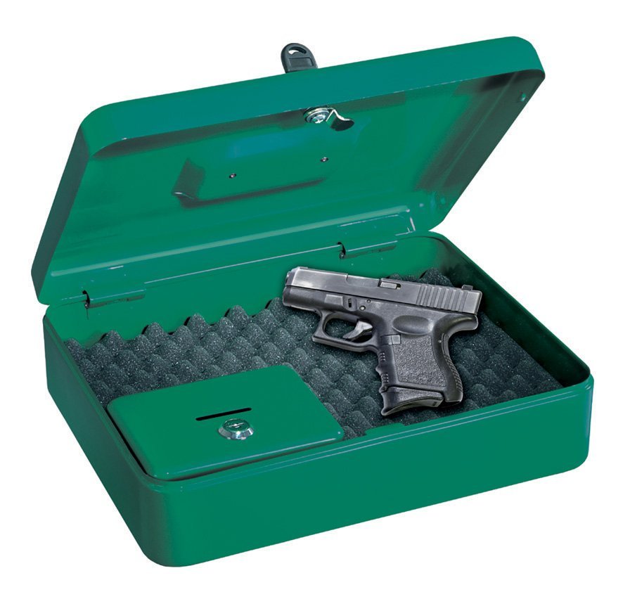 The box for short weapons is made of high-quality sheet metal, nickel-plated holder, lockable. Height 90 x width 300 x depth 240 mm. Color RAL 6002 green.