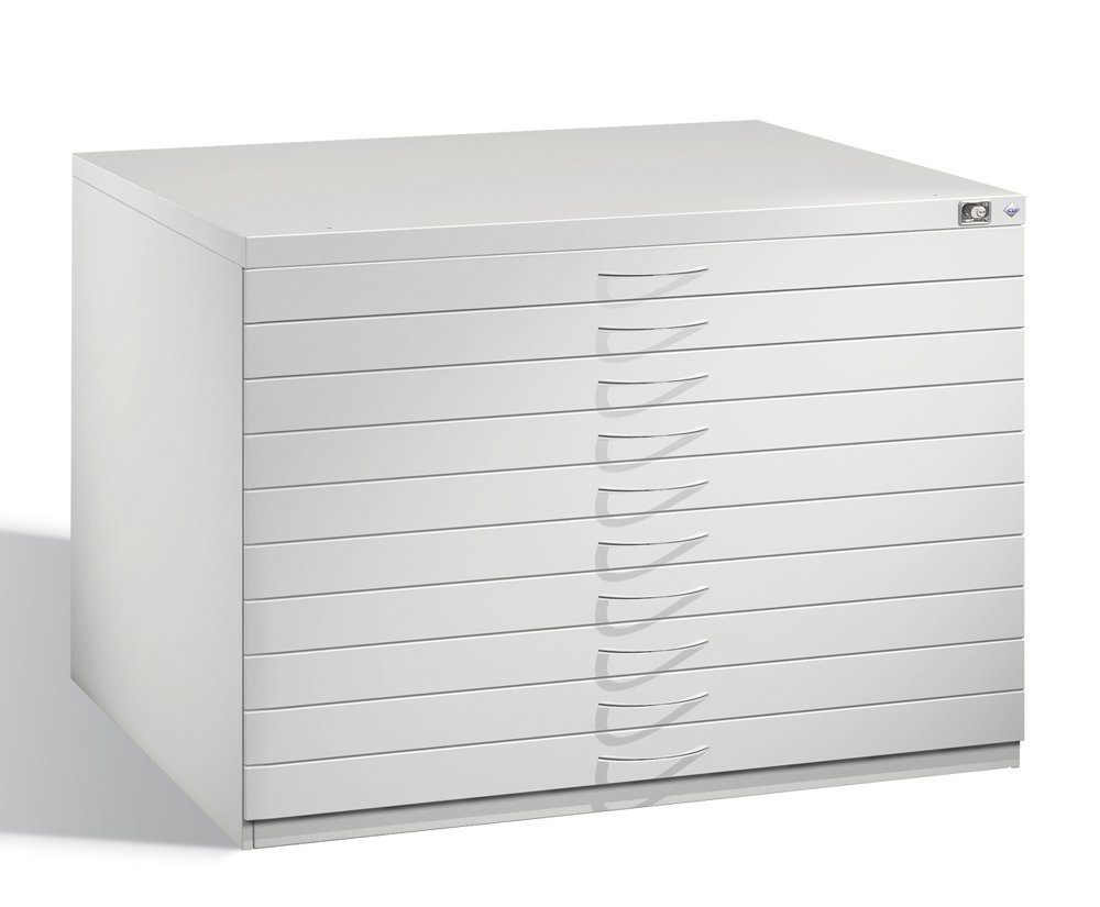 A ten-drawer drawing cabinet, A1 format, height 760, width 1100, depth 765 mm. Durable steel construction, central cylinder key locking. Drawer capacity 40 kg. Color RAL 7035 light gray.