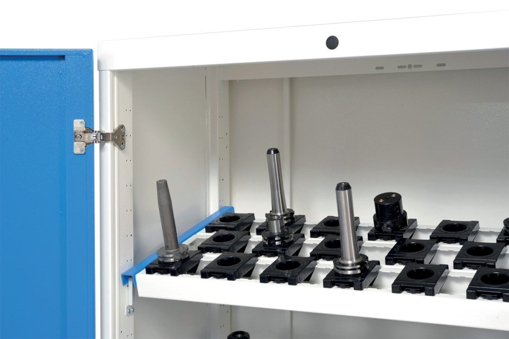 Cabinet for NC tools with swing doors. Height 1838 x width 980 x depth 500 mm. The cabinet includes carriers and plastic holders for CNC tools with the option of choosing between holder sizes E1, E2 or E3. The supplied and maximum number of holders and other information see the table in the detailed description (see the full description in the left menu).