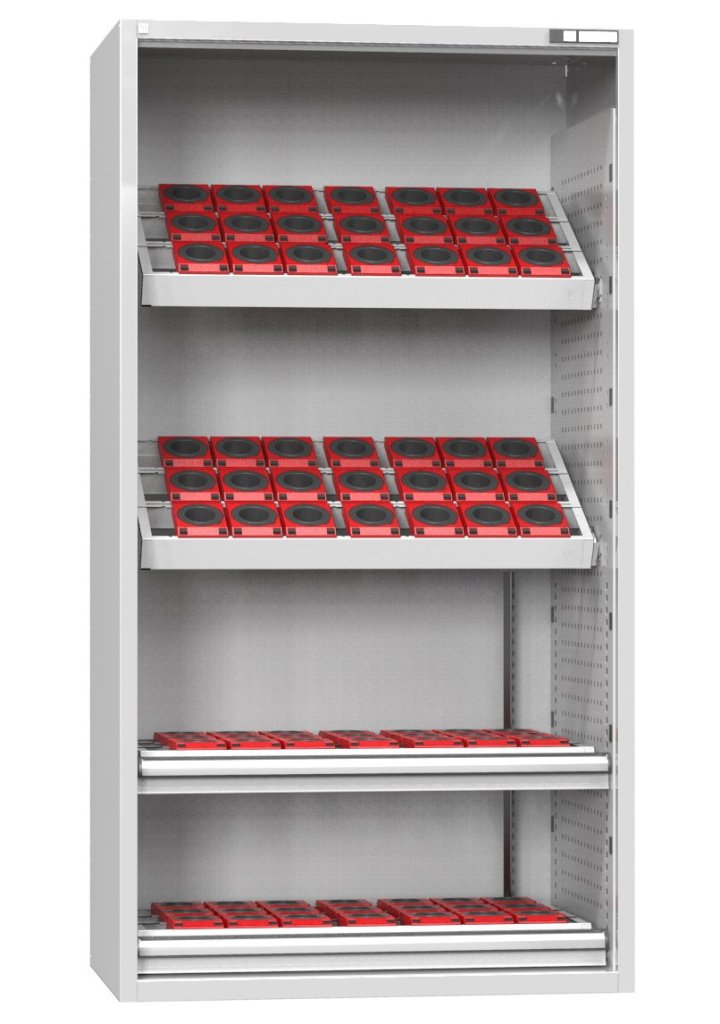 Cabinet for NC tools with swing solid doors, load capacity 600 kg. Height 1950, width 1044, depth 655 mm. Equipment 2x tool frame for the cabinet, 2x 75 mm drawer with full extension + 2x tool frame for the drawer. Without tool holders or including various holders - see Product variants or the table in the detailed product description.