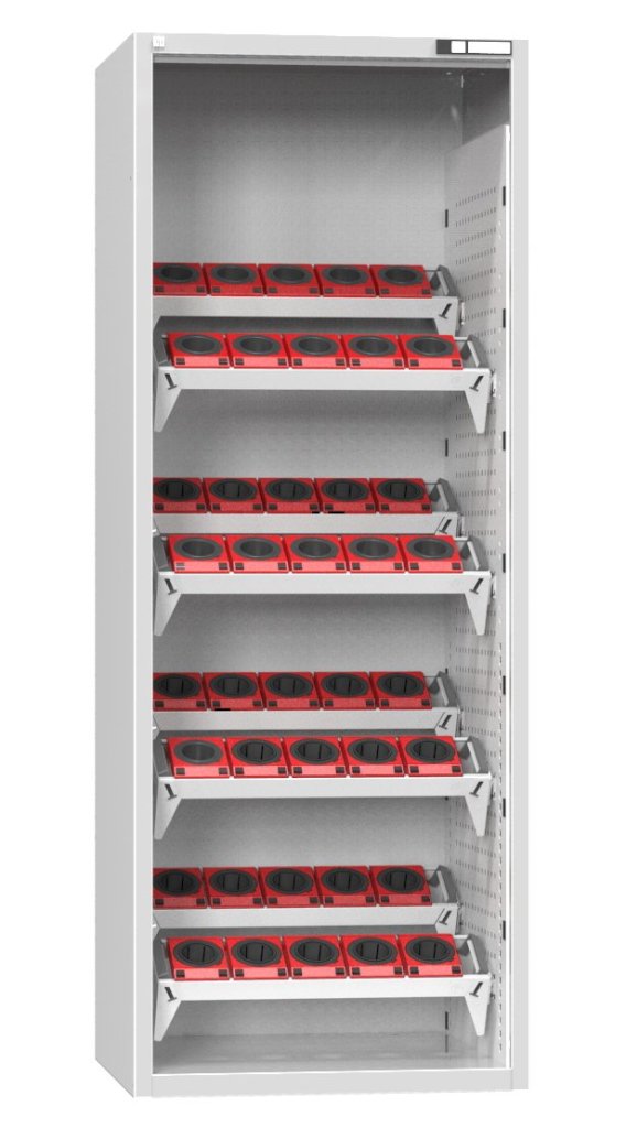 Cabinet for NC tools with hinged solid doors, load capacity 600 kg. Height 1950, width 1044, depth 655 mm. Equipment 4x tool frame in the cabinet, without tool holders or including various holders - see Product variants or the table in the detailed product description.