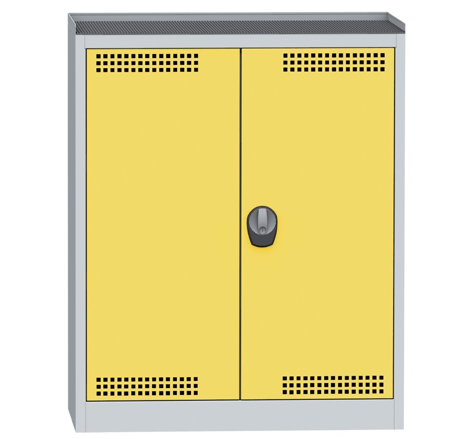 Cabinet for storing chemicals with trays for collecting liquids. The cabinet is equipped with 2 adjustable shelves in the shape of a tray with a robust perforated galvanized grid and one deeper tray at the bottom of the cabinet without a grid. Height 1180 x width 950 x depth 500 mm, shelf load capacity 60 kg, body load capacity 300 kg. In stock in body color gray RAL 7035, door color RAL 1023.