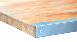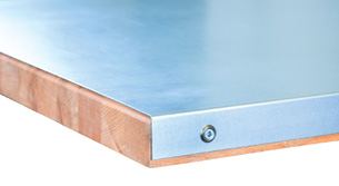 The front edge of the plate is plated with galvanized or stainless steel sheet 1 mm thick. The sheeting is U-shaped, so the plate is protected from above and below. The upper part of the plate is lowered in the place of plating so that the plating continues smoothly on the plate. We offer plating for beech joints of thickness 25 and 40 mm.