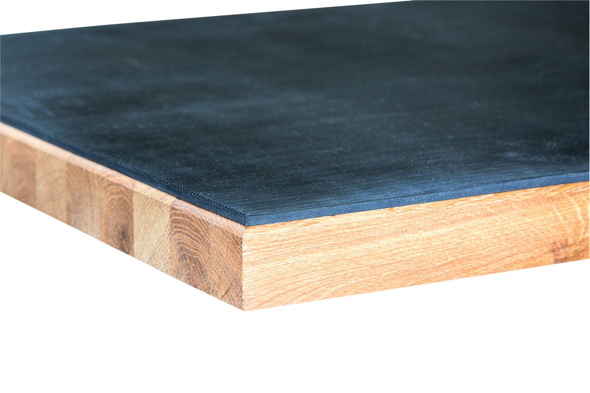 • top surface with steel frame 30 mm grooved rubber 3 mm can be replaced with laminate board 18 mm or beech joint 25 mm
