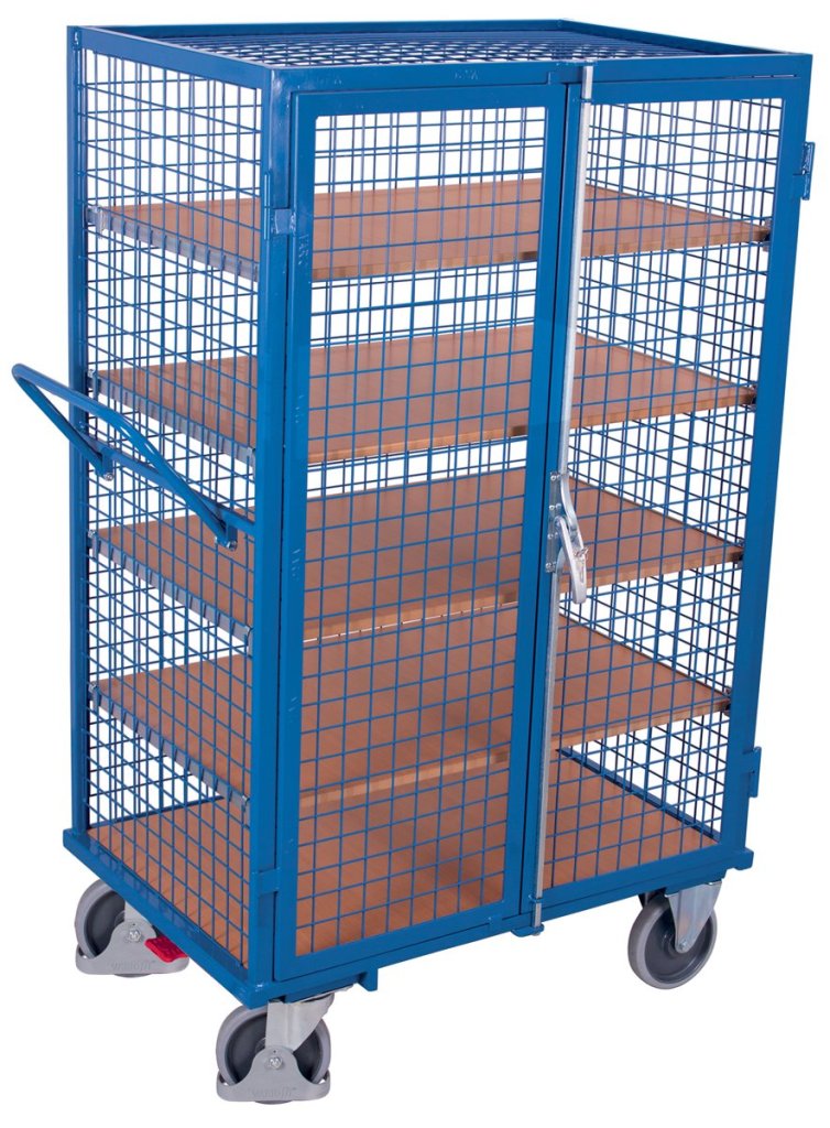 Trolley made of steel construction, with tubular handle, fully welded, double-winged door that can be closed with a wheelbase mechanism with cylinder lock. Base and shelves made of wood-based material, beech finish. 1 fixed shelf, 4 adjustable by 50 mm. Construction and doors in RAL 5010 gentian blue. Highly durable thermoplastic wheels, 2 swivel with central Easy Stop brake and 2 fixed. Height 1810 mm, width 1115 mm, depth 810 mm.