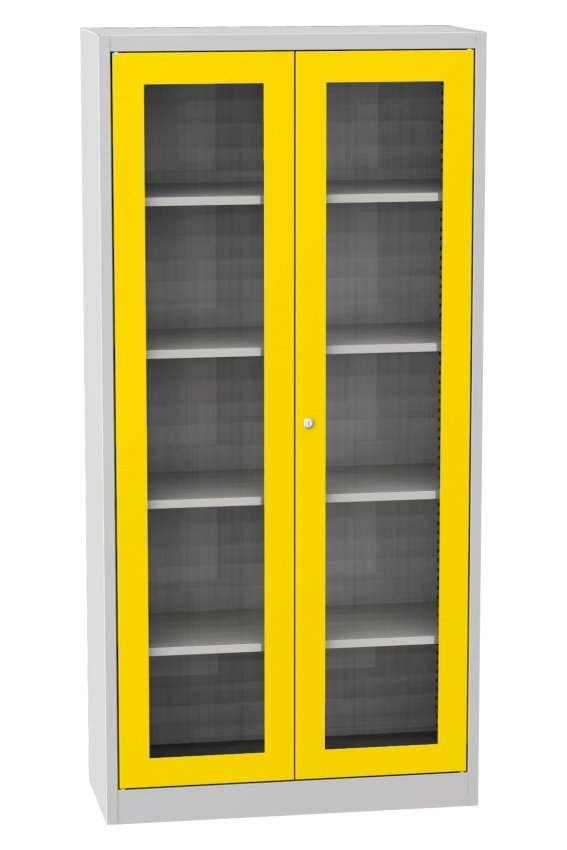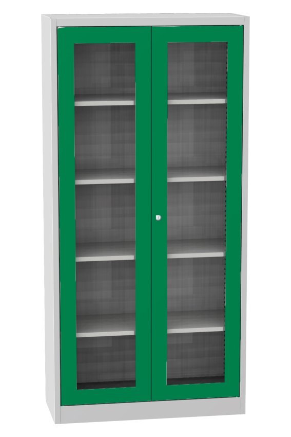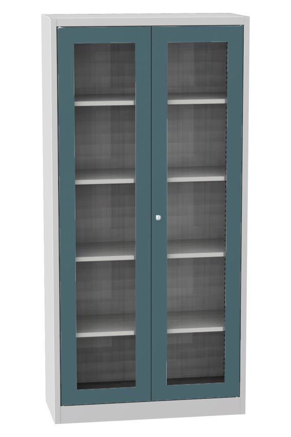 Two-door cabinet with plinth and glass door inlay, width 950, height 1950, depth 400 mm, 4 shelves. The possibility of replacing the glass-filled door with a wire-filled door or laminate door in the shade of beech, birch or cherry. Body color RAL 7035 light gray.