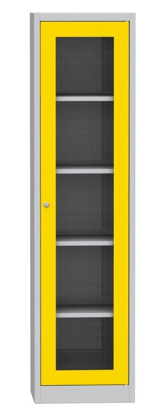 Cabinet with glass doors, height 1950 x width 505 x depth 400 mm. Locking on a cylinder lock with a wheelbase mechanism. 4 x adjustable steel shelves (load capacity 60 kg). The glass door is made of tempered glass.
