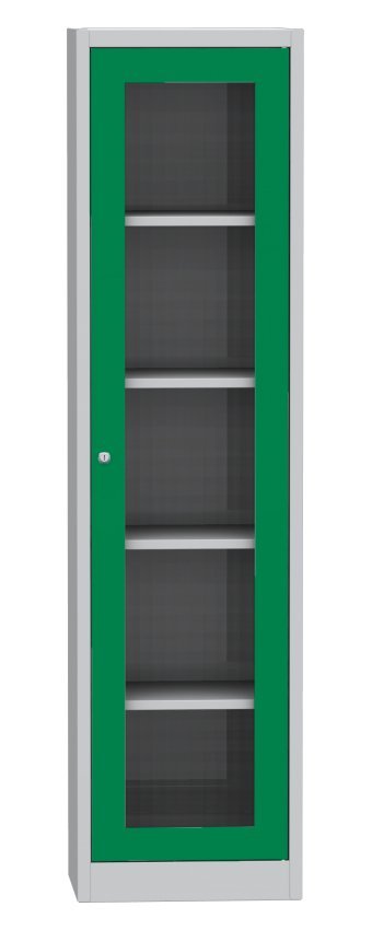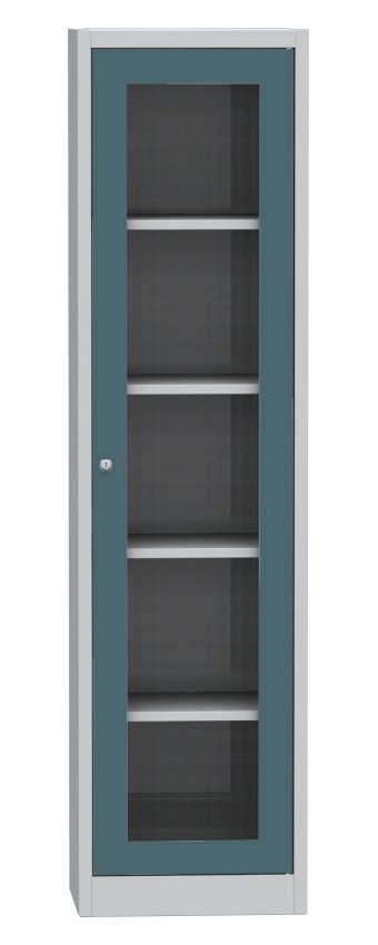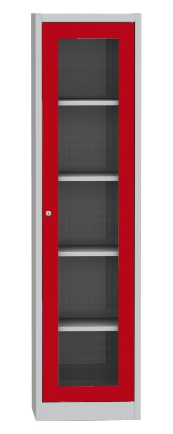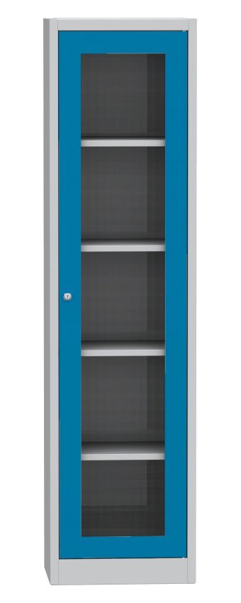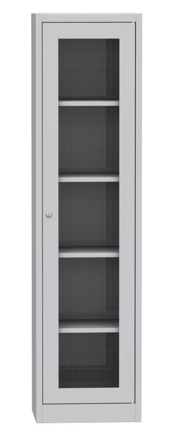 Cabinet with glass doors, height 1950 x width 505 x depth 400 mm. Locking on a cylinder lock with a wheelbase mechanism. 4 x adjustable steel shelves (load capacity 60 kg). Glass doors are made of tempered glass. Possibility of replacing doors with glass filling with doors with wire filling or laminate doors in the shade of beech, birch or cherry. Body color RAL 7035 light gray.