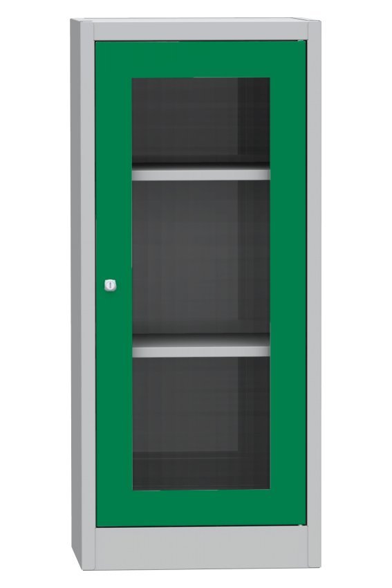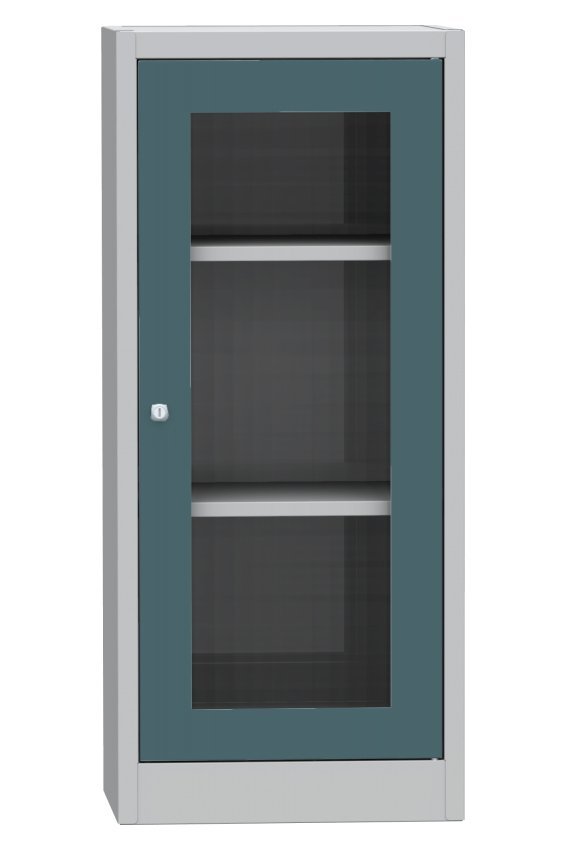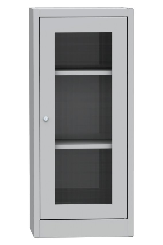 Cabinet with glass doors, height 1150 x width 505 x depth 400 mm. Locking on a cylinder lock with a wheelbase mechanism. 2 x adjustable steel shelves (load capacity 60 kg). Glass doors are made of tempered glass. Possibility of replacing doors with glass filling with doors with wire filling or laminate doors in the shade of beech, birch or cherry. Body color RAL 7035 light gray.