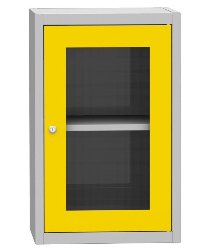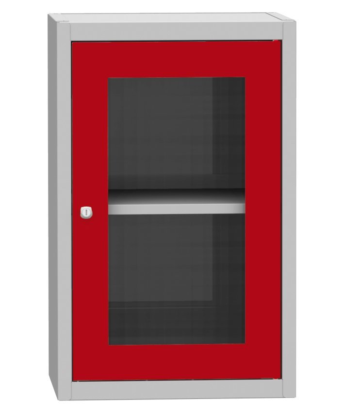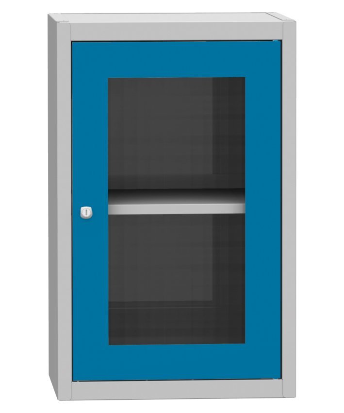 Cabinet with glass doors, height 800 x width 505 x depth 400 mm. Locking on a cylinder lock with a wheelbase mechanism. 1 x adjustable steel shelf (load capacity 60 kg). Glass doors are made of tempered glass. Body color RAL 7035 light gray.