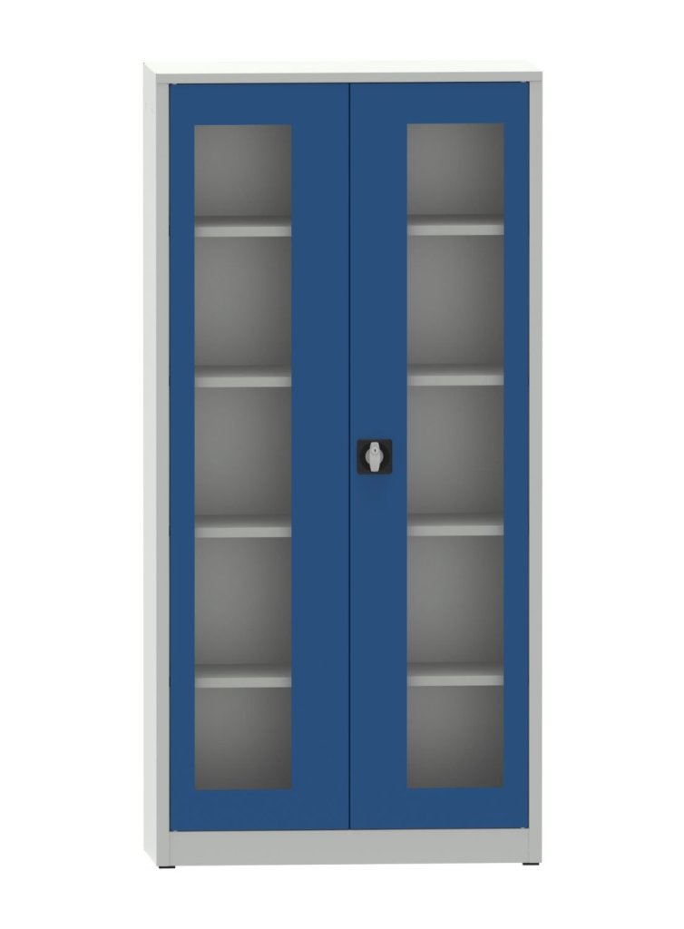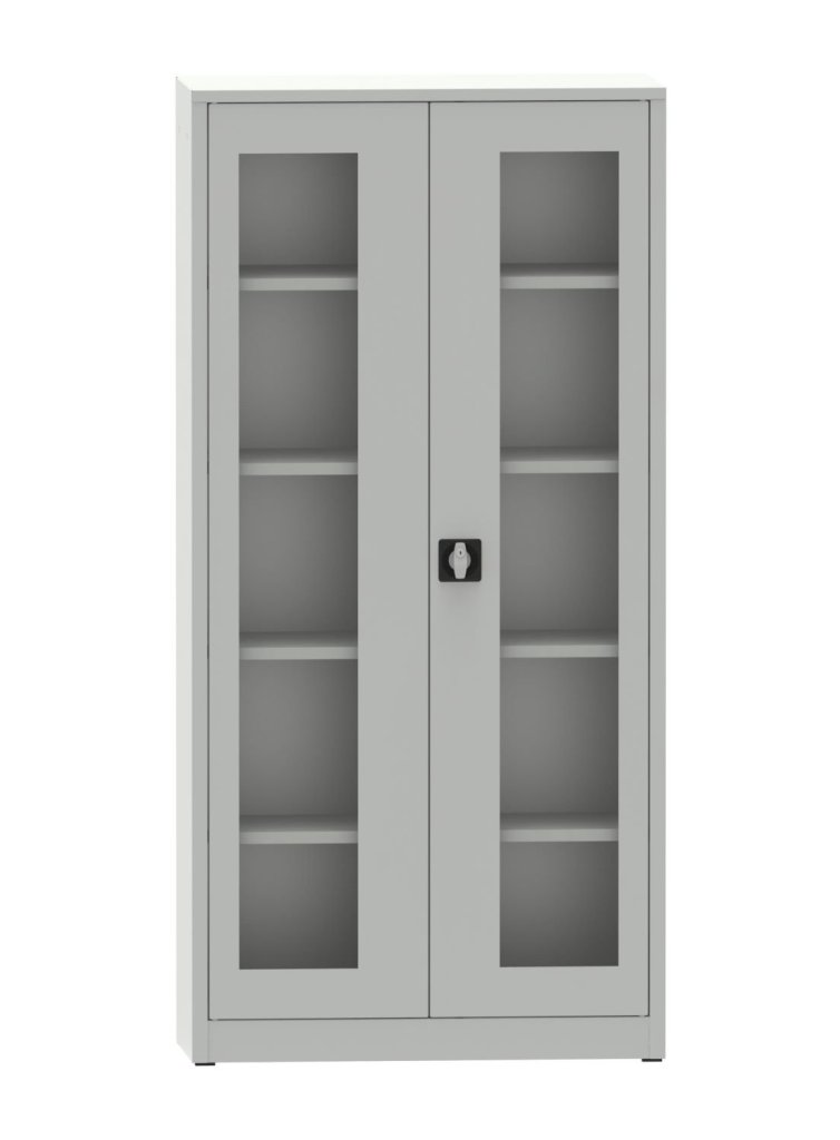Two-door filing cabinet. Height 1950 x width 950 x depth 400 mm, 4 shelves. Wheelbase lock. Body color RAL 7035 light gray. It is delivered disassembled - easy assembly.