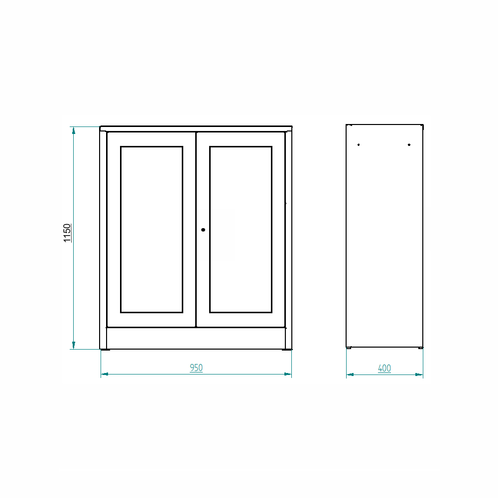 Two-door filing cabinet. Height 500 x width 950 x depth 400 mm, without shelf. Wheelbase lock. Body color RAL 7035 light gray. It is delivered disassembled - easy assembly.