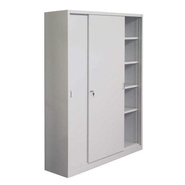 Metal cabinet with sliding doors and 4 shelves. Various colors to choose from. Height 1990 x width 1400 x depth 435mm.