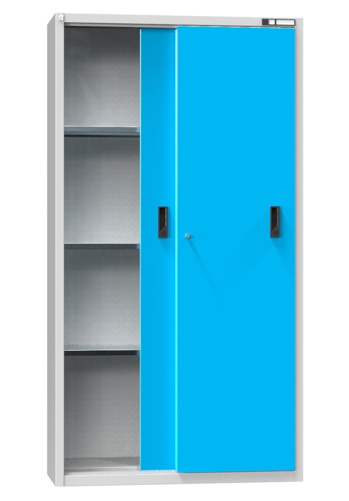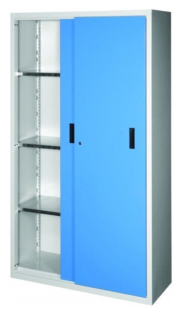 Cabinet with sliding doors, 3 x shelves adjustable in 25 mm increments (galvanized), solid doors, load capacity 600 kg. Height full description and parameters
