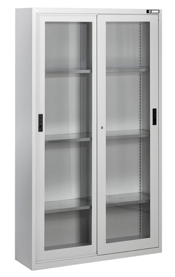 Cabinet with sliding doors, 3 x shelves adjustable in 25 mm increments (galvanized), solid doors, load capacity 600 kg. Height 1950 x width 1044 x depth 405 mm, glass door in a steel frame.