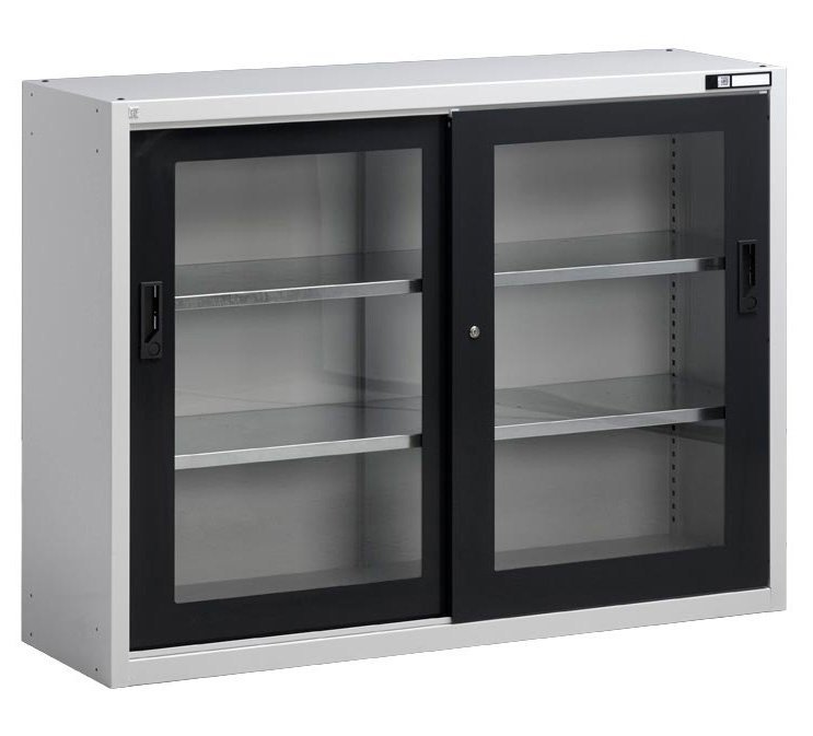 Cabinet with sliding doors, 2 x shelves adjustable by 25 mm (galvanized), solid doors, load capacity 300 kg. Height 1000 x width 1350 x depth 405 mm, glass door in steel frame.