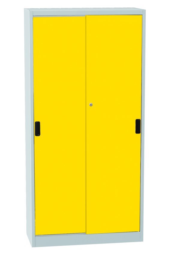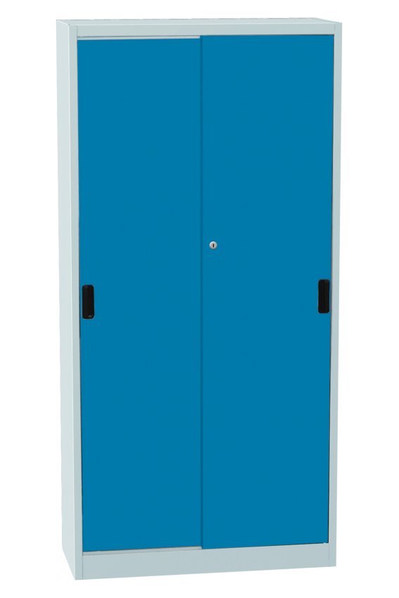 Metal cabinet with sliding doors, height 1150 x width 950 x depth 400 mm, 2 adjustable shelves. Sliding door with lock in several color shades, body light gray RAL 7035.