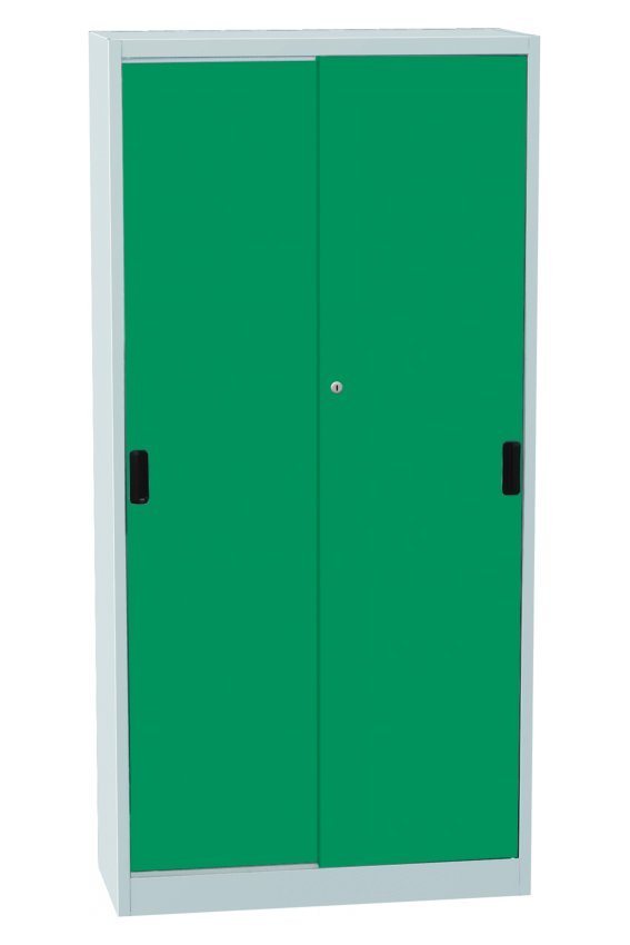 Metal cabinet with sliding doors, height 1950 x width 950 x depth 400 mm, 4 adjustable shelves. Sliding door with lock in several color shades, body light gray RAL 7035.