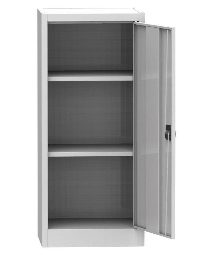 Cabinet with solid doors, height 800 x width 505 x depth 400 mm. Locking on a cylinder lock with a wheelbase mechanism. 1 x adjustable steel shelf (load capacity 60 kg). The possibility of replacing solid doors with doors with glass filling, with wire filling or laminate doors in the shade of beech, birch or cherry. Body color RAL 7035 light gray.