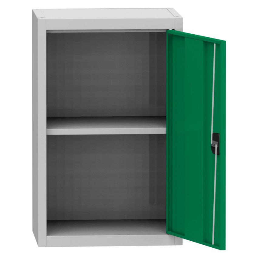 Metal cabinet with sliding doors, height 800 x width 950 x depth 400 mm, 1x adjustable shelf. Sliding door with lock in several color shades, body light gray RAL 7035.